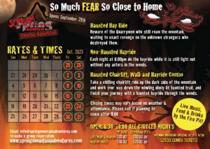 Take a chilling chairlift ride up the dark side of the mountain and work your way down the winding and dimly lit trail. Your reward when you make it down? A Haunted Hay Ride will be waiting to continue your journey, to the remains of the Quarrymen murdered in their sleep.NO RESERVATION NECESSARY UNLESS YOU HAVE A GROUP OF 20 OR MORE. TICKETS ON SALE AT 6:30. LIFTS START AND FIRST WAGONS GO ABOUT 7PM.